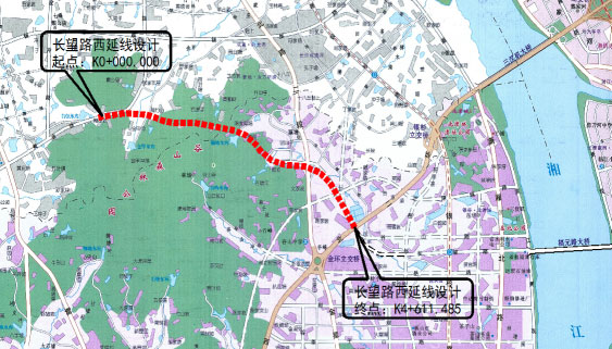 長望路西延線位于湘江新區(qū)范圍內(nèi),路線呈東西走向。道路西接黃金大道,往東沿谷山森林公園北側(cè)山體埡口,穿過龍湖湘風(fēng)原著,往東接現(xiàn)狀金星北路,再向東南連接現(xiàn)狀西二環(huán),道路全長4.611KM,并對長望路(西二環(huán)-觀沙路)段進行了改擴建設(shè)計,長度0.611KM,金星路、黃金大道立交范圍內(nèi)的主線及輔道進行改造。本標段范圍為K0+000-K1+520。其中包括跨線一座、下穿式矩形框架橋一座、地下人行通道一座,線路設(shè)計為城市主干路、設(shè)計車速60km/h。