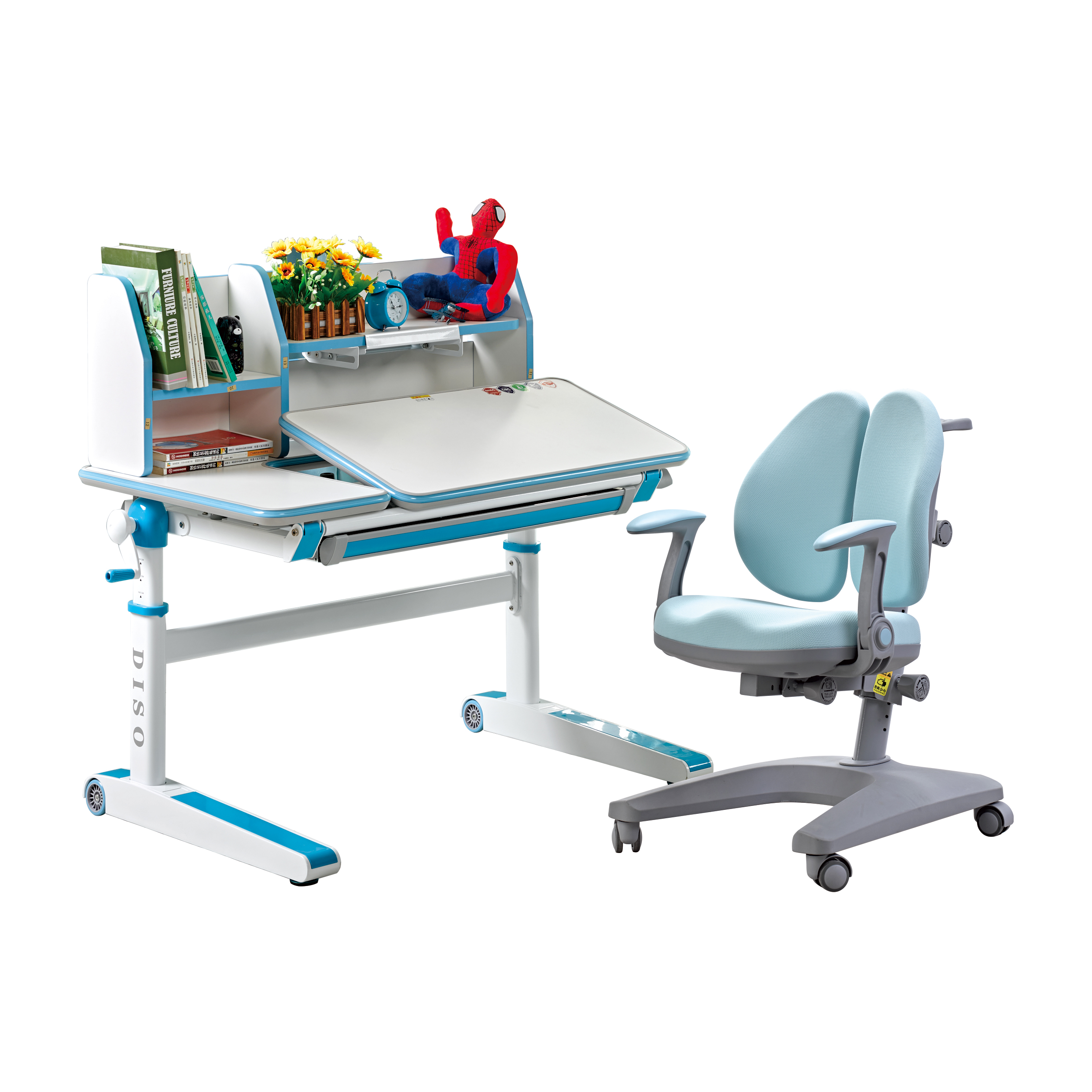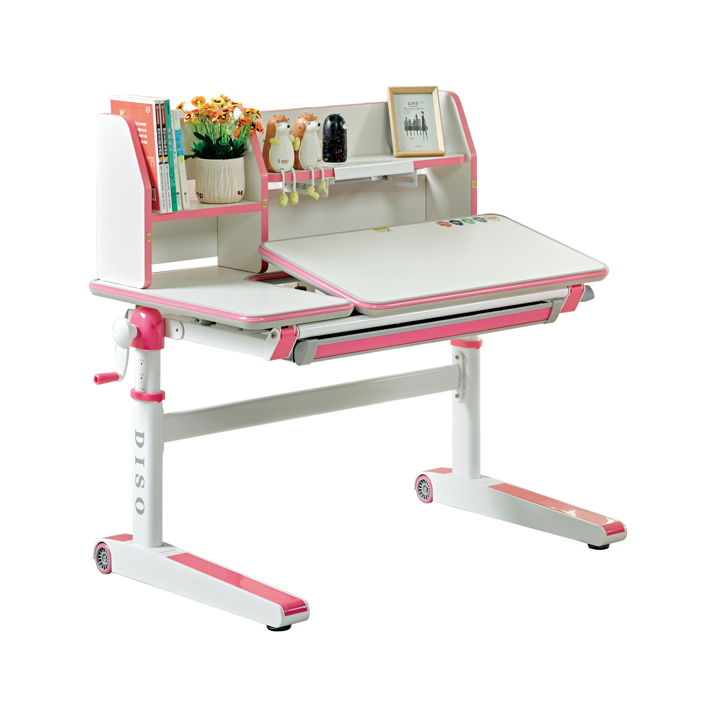核心功能:桌面横梁内置物理传动装置,通过摇动摇柄即可轻松上升和下降;拉动线控手柄即可实现桌面无极角度倾斜,读书、写字、画画角度随意调节。 |