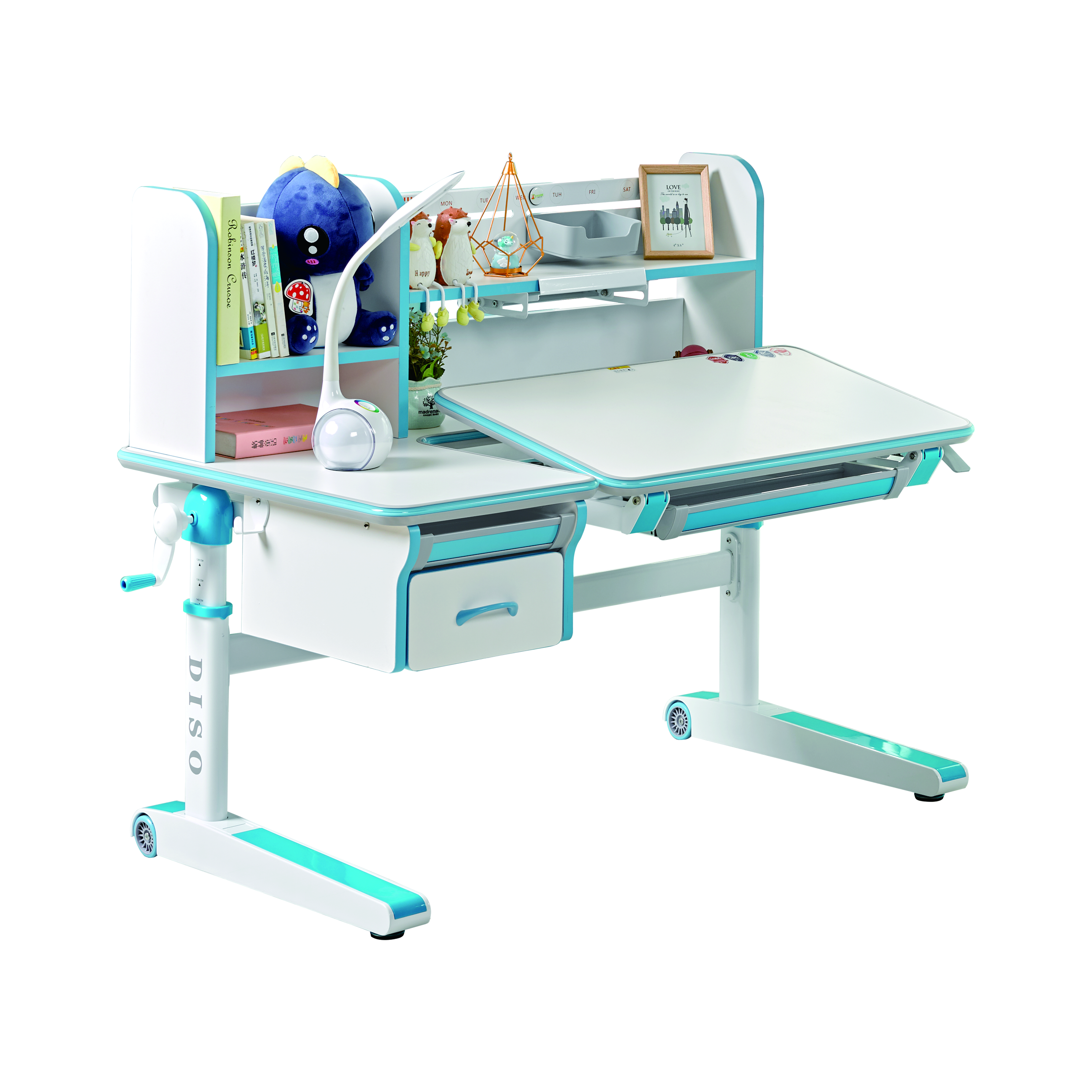 核心功能:桌面横梁内置物理传动装置,通过摇动摇柄即可轻松上升和下降;拉动线控手柄即可实现桌面无极角度倾斜,读书、写字、画画角度随意调节。 |