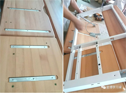 防翘槽+定型钢板,能彻底解决变形开裂? 星博实木学习桌 除选材用料上有别于一般品牌。工艺结构上除了必要的常规做法外,还增加了独门绝学——防翘槽+定型碳钢板;此工艺为当下国际通用标准,即在木板反面CNC铣出3-5条30mm宽凹形槽,其中在凹形槽的一边深度为12mm,然后镶嵌L型4mm厚折弯碳钢板,将面板牢牢固定在碳钢板上。钢板的硬度足以将已变形的面板拉平,由于钢板与桌面板紧密贴合 自攻螺丝锁紧后, 横竖均被牢牢拉紧,以至于不会变形和开裂。 |